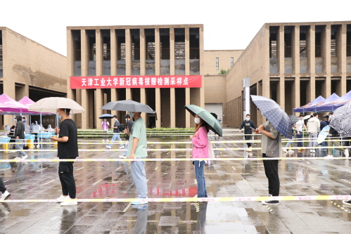 学校励志广场,现场有条不紊,秩序井然。各检测通道设置测温区、等待区、登记区、采样区,场地周边设样品收集区、急救区等区域。现场设置单向出入口,全员全程佩戴好口罩,保持间距排队,学生们按照要求分时、分批到达采样点,检测工作快速、有序开展。学校与属地政府及卫生健康委通力协作,学校各部门之间齐心配合,工作人员各司其职。学校相关处室工作人员、党员突击队和学生志愿者在雨中坚守……一个个忙碌的身影构成了平安校园动人的画面,他们身体力行地书写了天工人爱岗敬业、不惧困难、团结奋斗的精神,为学校疫情防控工作贡献自己的力量。
