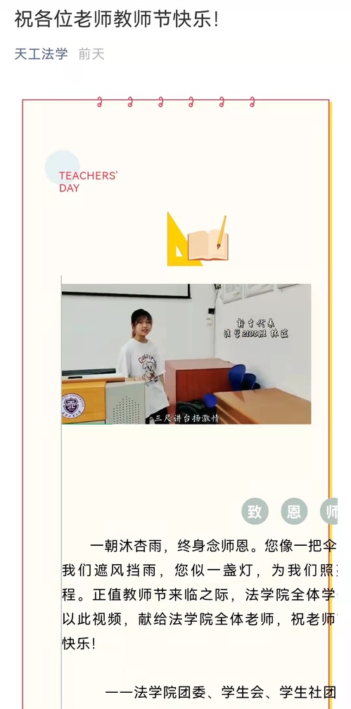 与此同时,法学院团委、学生会和学生社团组织学生录制了视频《致恩师》。视频取景泮湖、图书馆、模拟法庭等地标场所,镜头闪转间,莘莘学子满含深情表达着“一朝沐杏雨,终身念师恩”的情怀。各位同学还为学院全体教师精心制作了贺卡,为老师们送上节日的祝福。
