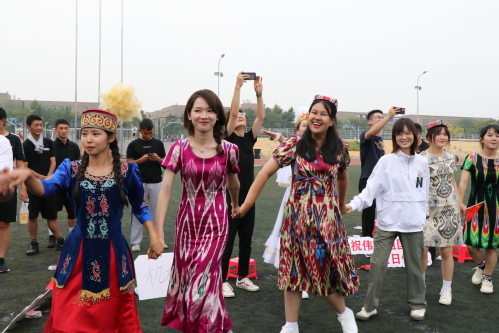 活动中特别设置了“学党史·悟思想”知识竞答环节,同学们踊跃参加。2021级预科新生带来了《这里是新疆》舞蹈表演,几名维吾尔族男同学在欢快的音乐声中跳起了国家级非物质文化遗产之一的萨玛舞,师生们深受感染,手拉手围成同心圆,一起随之起舞;师生们自发“快闪”,全场起立挥舞着国旗,共同高唱《我和我的祖国》,深情表白祖国,祝福祖国繁荣昌盛,将活动推向高潮。