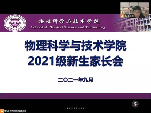 9月10日晚,物理科学与技术学院2021级新生线上家长会顺利召开。张海明院长、贾彦军副书记,全体辅导员以及2021级新生家长参加。会议由贾彦军副书记主持。会议伊始,张海明院长向新生家长介绍了学院的发展历程、学科简介、专业方向、培养目标、专业特色等,方便家长了解学院专业特色。随后,贾彦军副书记介绍了学院的各项管理规定,建议家长在关心学生学业的同时,也要时刻关注学生的生涯规划和健康成长,加强与学院的协同教育。团委书记兼学办主任胡洋老师介绍了保研的相关政策,辅导员王亚琼老师普及了天津市征兵相关政策及待遇。