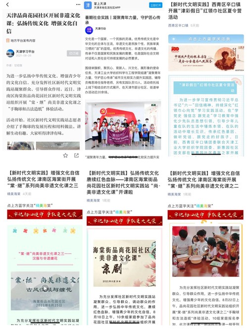 2021年7月至9月,天津工业大学纺织科学与工程学院“凝聚青年力量,守护匠心传承”城市文化软实力提升实践团,在天津市津南区品尚花园社区、河西区宽福里社区、河西区金海湾花园社区、北辰区引河里社区等地组织开展20余场传统文化宣讲、传统文化展示、传统文化体验活动,服务时长600余时,深受广大群众好评。实践事迹被学习强国、掌上天津等多家媒体报道。