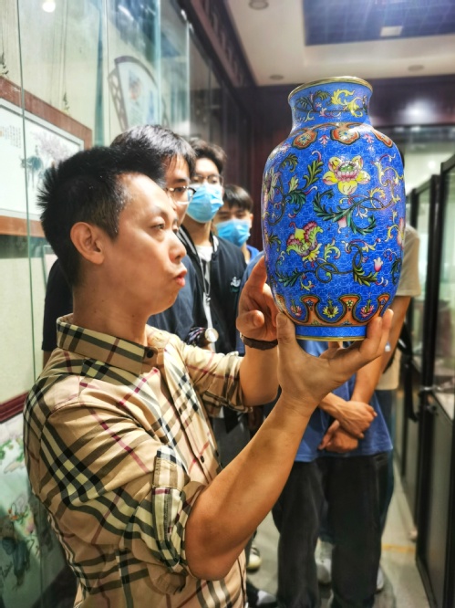 康意平老师重点介绍了扒花工艺。扒花(耙花)是出现于乾隆时期的一种陶瓷装饰技术。在高温烧制的白瓷上,用粉彩满绘,再用针装工具细细刻画纹饰,然后进行低温烧制。扒花的扒,就是在釉彩上做精细的刻画。扒花装饰方法一般都是满装饰,纹饰细小。对匠人而言,是一种重复、枯燥、细致的活,费眼费神,又必须精神专注,心手相应,一丝不乱。学员们欣赏着瓷器上栩栩如生的动物、植物和雄伟壮阔的山川河流,惊叹每件精美瓷器的来之不易,震撼于陶瓷里的中国之美,也增加了对青花瓷、玲珑瓷、青白瓷以及斗彩、珐琅彩的了解。