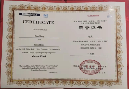 2021年10月6日,在成都举行的第26届中国日报社21世纪可口可乐杯英语演讲比赛全国总决赛中,代表天津市参赛的我校英语1904赵晟同学(指导教师:朱丽巍)取得了全国二等奖的优异成绩,成为我校近20年来第一位站上全国英语演讲比赛舞台的天工学子,也是继我校在2020年“外研社·国才杯”英语演讲比赛中获得天津市一等奖之后的又一突破。