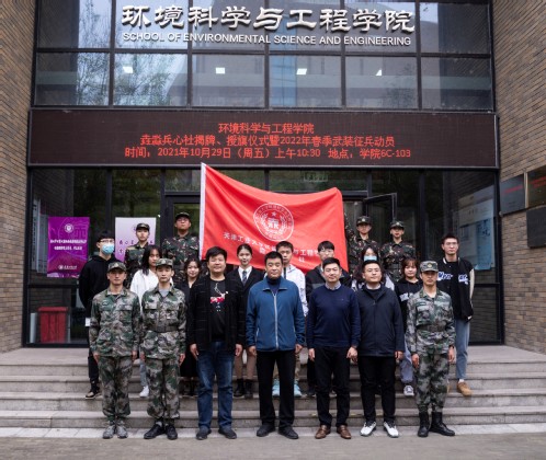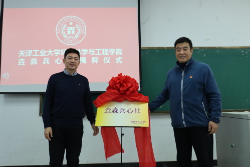 会上,全体人员齐唱《中华人民共和国国歌》。人民武装部部长张志勇老师和学院党委副书记曹鸿斌老师共同为环境科学与工程学院垚淼兵心社揭牌。