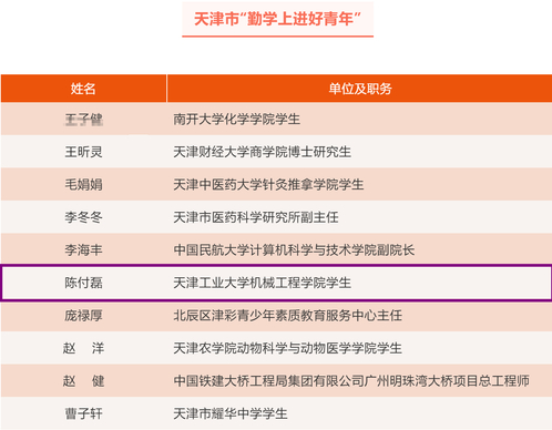近日,共青团天津市委员会公布了2021年“天津向上向善好青年”名单,我校机械工程学院2017级本科生陈付磊获评天津市“勤学上进好青年”。