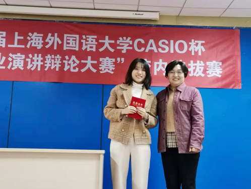 经过激烈角逐,2021级研究生刘紫烨同学因其稳健的台风、精准的表达荣获一等奖,并将代表我校参加“第十四届上海外国语大学CASIO杯中国日语专业本科生・研究生演讲辩论大赛”半决赛。孙薇教授为刘紫烨同学颁发了获奖证书。