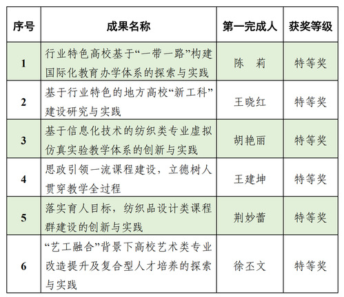 教学成果奖是学校教育教学水平的综合体现,“纺织之光”高等教育教学成果奖是体现纺织类高校高等教育水平的最高奖项,对增强学校内涵发展、助力我校“双一流”建设具有重大意义。此次获奖是学校持续推动教育教学改革的必然结果,也是对我校人才培养质量提升的集中体现。