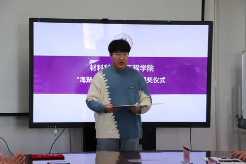 海聚化工有限公司总经理杨阳讲话。他首先感谢天津工业大学材料科学与工程学院多年来为社会输送了一批又一批优秀的材料学人才,其次,祝贺本次获奖学生并用自己的求学经历勉励同学们继续努力,最后,他祝愿学院师生在未来能够再创佳绩。