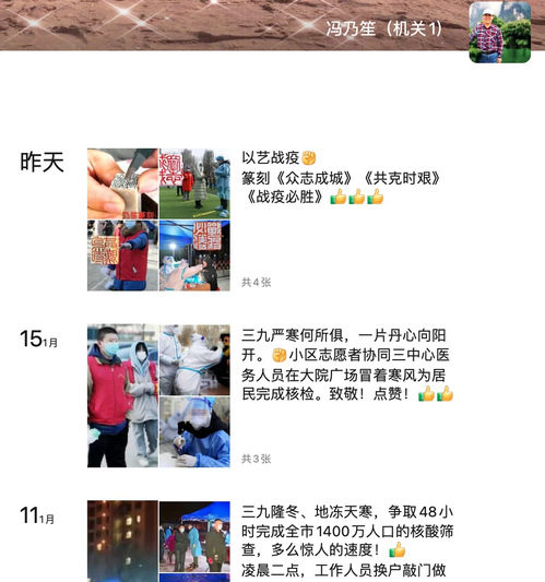 机关一退休党支部书记冯乃笙老师用镜头记录下小区志愿者协同三中心医务人员在社区广场冒着寒风为居民完成核酸检测的画面。冯老师在朋友圈这样说:“三九隆冬、地冻天寒,争取48小时完成全市1400万人口的核酸筛查,多么惊人的速度!……医务人员、工作者、志愿者冒着严寒通宵达旦奋战,受检者全力配合秩序井然……面对疫情我们心手相牵共克时艰,坚决打赢这场硬仗,坚信家乡的明天会更加美好。”在得知我校第一批师生志愿者出征津南的消息后,冯老师又创作了篆刻作品《众志成城》《共克时艰》《战疫必胜》,向冲锋在前的战疫人员致敬!为天津加油!