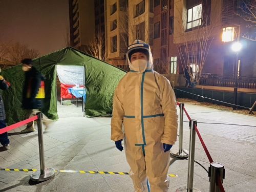 经济与管理学院党委副书记刘建准在精武镇大南河村祥和园社区做下沉志愿者。他每天在小区西门值勤,执行扫码检验、核实身份的任务,确保进出车辆和行人的安全。期间,他还参加了两次大筛工作。刘老师说:“作为一名党员,要率先垂范,发挥模范带头作用,尽自己努力守护一方平安。”