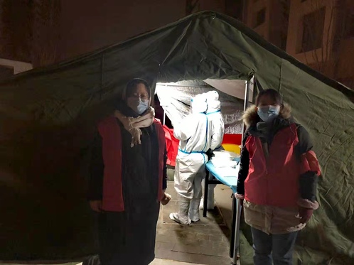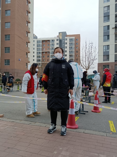 机械工程学院党委委员牛雪娟老师下沉至精武镇格调松间社区做志愿者,参与“三筛”“四筛”,清晨5点天还未亮就到岗,协助居委会准备防疫物资,维持检测现场秩序。平日每天早晨8点半准时到社区报到,在门岗执勤。牛老师说:“志愿服务工作连续开展近十天了,天气寒冷,身体也很疲惫,但是下沉志愿者们都在坚持、坚守!”