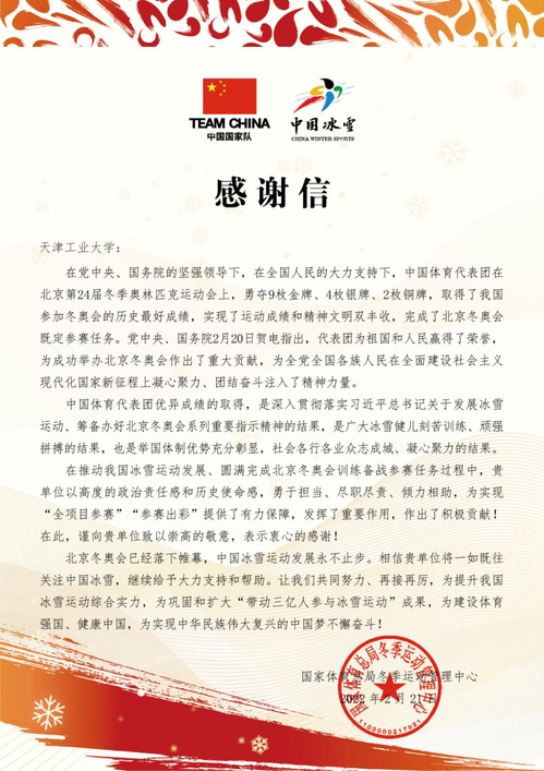 国家体育总局冬季运动管理中心在感谢信中称,天津工业大学以高度的政治责任和历史使命感,勇于担当、尽职尽责、倾力相助,为实现“全项目参赛”“参赛出彩”提供了有力保障,发挥了重要作用,作出了积极贡献。