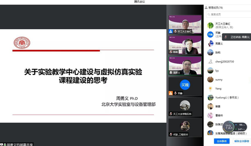 2022年3月11日下午,我校召开“关于实验教学示范中心与虚拟仿真实验课程建设的思考”线上研讨会。会议特邀北京大学实验室与设备管理部副部长、国家级实验示范中心联席会副秘书长、教育部虚拟仿真实验教学创新联盟副秘书长周勇义作题为《关于实验教学示范中心与虚拟仿真实验课程建设的思考》的报告。常务副校长陈莉出席会议并致辞,各教学单位主管本科教学工作负责人、实验教学示范中心负责人、虚拟仿真实验教学中心负责人、虚拟仿真一流课程负责人及教师代表共83人参加。本次研讨会也是我校天工一流本科教育研讨沙龙第五期活动。研讨会由教务处处长王春红主持。