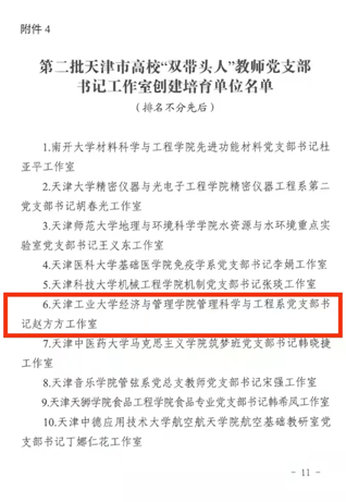 近日,市委教育工委、市教委公布了第二批新时代天津市高校党建“领航工程”创建培育单位名单,经济与管理学院管理科学与工程系党支部书记赵方方工作室成功入选第二批天津市高校“双带头人”教师党支部工作室创建培育单位,创建培育时限即日起至2023年12月。