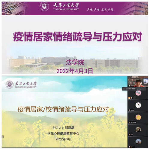 为有效缓解学生因疫情居家学习生活而产生的心理压力,提升学生心理调适能力,2022年4月3日,法学院邀请学生心理健康教育中心邓晶晶老师为所有班级班长、团支书、心理委员及在校学生开展主题为“疫情居家情绪疏导与压力应对”的心理健康讲座。学院党委副书记李兰、学生工作办公室主任宋至刚参会。会议由辅导员马文凯主持。