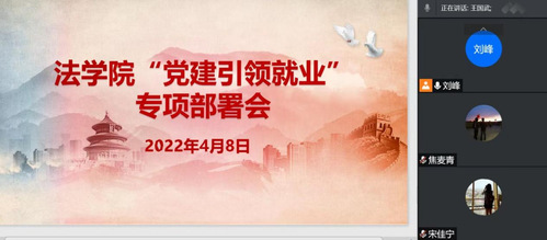 为深入开展“迎盛会、铸忠诚、强担当、创业绩”主题学习宣传教育实践活动,推动“我为群众办实事”实践活动走深走实,有效发挥党建引领作用,做好2022届毕业生的就业工作,2022年4月8日下午,法学院组织线上召开“党建引领就业”专项部署会。学院领导班子成员、党委委员、师生党支部书记、辅导员、组织员等参加会议。会议由学院党委副书记李兰主持。