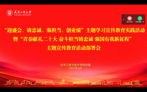 2022年4月14日下午,化学工程与技术学院召开“迎盛会、铸忠诚、强担当、创业绩”主题学习宣传教育实践活动暨“青春献礼二十大 奋斗担当铸忠诚 强国有我新征程”主题宣传教育活动部署会议。会议以视频形式召开,学院党委班子成员、教师及学生党支部书记、专职组织员参加了会议。