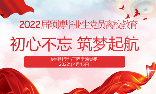 2022年4月15日,“初心不改,筑梦起航——青春献礼二十大暨材料科学与工程学院党委2022届研究生党员离校教育”大会于线上召开。学院党委书记赵义平、党委副书记曾华英、组织员许婧伟、6个研究生党支部书记以及64名毕业生党员参加了会议。