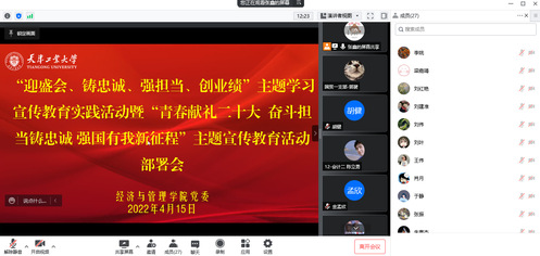 近日,经济与管理学院党委召开“迎盛会、铸忠诚、强担当、创业绩”主题学习宣传教育实践活动暨“青春献礼二十大 奋斗担当铸忠诚 强国有我新征程”主题宣传教育活动部署会议。会议以视频形式召开,学院党委书记、副书记、全体师生党支部书记参加。