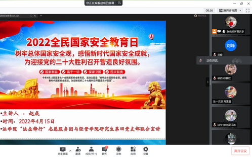 首先,法学院“法垒锋行”志愿服务团团长、法学研究生第一党支部赵成同学围绕全民国家安全教育日的主题,以《国家安全法》《反间谍法》《反恐怖主义法》等与国家安全密切相关的法律法规为切入点,从节日由来、国家安全的内涵、重要性、国家安全教育的意义、危害国家安全的行为和罪名、大学生如何维护国家安全等方面进行了详细讲解。赵成同学表示,作为当代大学生,我们要高度重视国家安全,强化风险意识,做到居安思危。