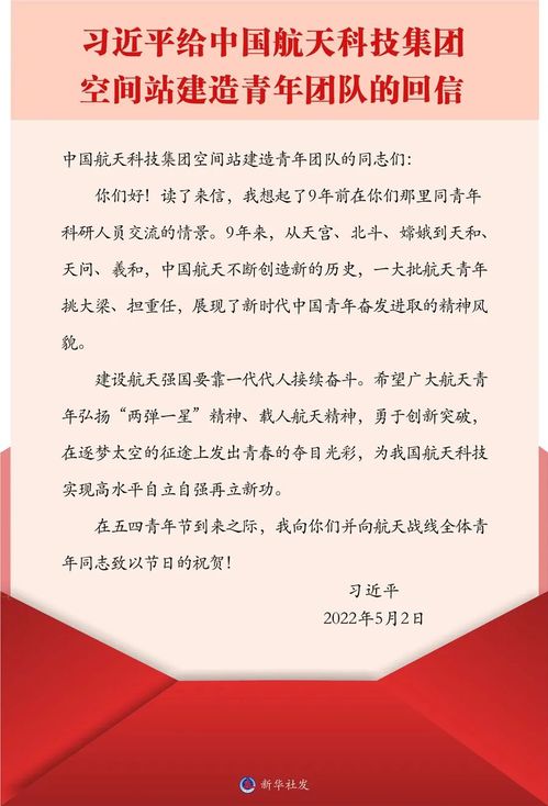 在五四青年节到来之际,中共中央总书记、国家主席、中央军委主席习近平5月2日给中国航天科技集团空间站建造青年团队回信,向航天战线全体青年致以节日的祝贺,并向他们提出殷切期望。