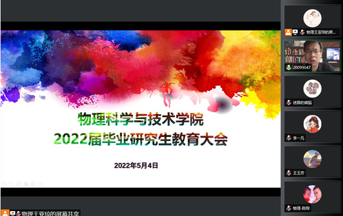 为进一步加强毕业生离校教育和毕业生党员的党性教育,5月4日下午,物理科学与技术学院通过腾讯会议召开了2022届毕业研究生教育大会暨毕业研究生主题党课教育活动。学院班子全体成员、导师代表、办公室、科研办、学生办工作人员以及2022届全体毕业研究生参加了此次大会。会议由学院党委副书记贾彦军主持。