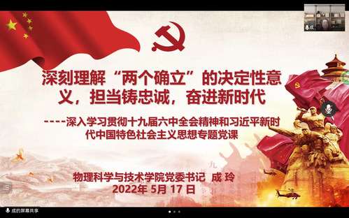 2022年5月17日晚,物理科学与技术学院党委书记成玲以“深刻理解‘两个确立’的决定性意义,担当铸忠诚,奋进新时代”为题讲授专题党课。本次专题党课是深入学习贯彻习近平新时代中国特色社会主义思想和党的十九届六中全会精神和的一次主题宣讲,也是学院党委理论学习中心组扩大学习和干部专题培训。学院党委委员、学院领导班子成员、各基层党支部书记、各系室(中心)主任以及各办公室行政管理人员聆听了本次党课。