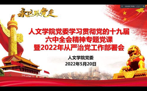 2022年5月20日,人文学院党委开展贯彻党的十九届六中全会精神专题党课暨2022年全面从严治党部署会,学院党委委员、纪委委员、师生党支部书记、党员代表参加了此次活动。