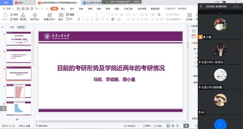 为更好地帮助有意向考研学生清晰个人定位,提高考研成功率,2022年6月4日,生命科学学院召开考研指导交流会。学院党总支副书记李鹏,副院长马明、陈瑞娟,以及师生共计68人参加了交流会。会议由学生工作办公室主任颜小星主持。