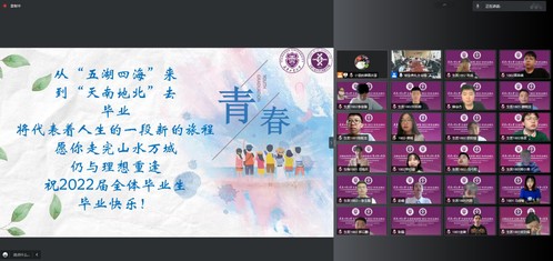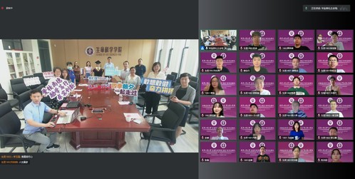 最后,大家起立奏唱校歌,毕业典礼缓缓落幕。伴随着“涌入人海,做一朵奔腾的浪花”歌声响起,主会场的老师们举起代表祝福的标牌,与云端同学们挥手互动,祝贺毕业快乐!新的征程已经开启,期待大家更好的相见!