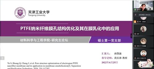 硕士第一党支部陈冰倩作题为《具有抗菌特性的疏松纳滤膜染料/盐分离性能的研究》的报告,介绍了一种通过改变物料配比,改善疏松纳滤膜的调节渗透截留性能,并使其获得优异的缓释抗菌效果的工艺方法;孙凯旋作题为《PTFE纳米纤维膜孔结构优化及其在膜乳化中的应用》的报告,该研究优化了PTFE纳米纤维膜孔的结构,解决静电纺丝PTFE纳米纤维膜三维网络孔结构不适用于膜乳化工艺的问题;窦小庆作题为《环氧化物和环酐的开环交替共聚》的报告,聚焦基础理论研究,证实了碱金属羧酸盐可以有效催化环氧化物和环酸酐的开环交替共聚;李楠作题为《多功能PVDF/CNT/GO混合超滤膜用于污染监测》的报告,提出了一种通过测量膜电阻来实现膜污染实时监测的有效方法。与会教师、学生针对汇报展开了深入研讨交流。