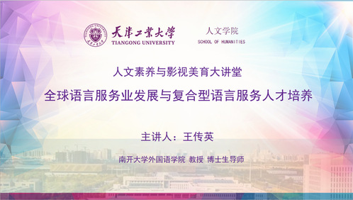 为提升学生人文素养,推进外国语言文学学科建设和翻译专业硕士学位(Master of Translation and Interpretation,MTI)授权点申报工作更好开展,2022年7月4日晚,人文学院线上举办了“人文素养与影视美育系列讲座”第二场。特邀南开大学外国语学院博士生导师王传英教授以“全球语言服务业发展与复合型语言服务人才培养”为题分享了自己的研究心得。会议由人文学院常务副院长张兴国主持。