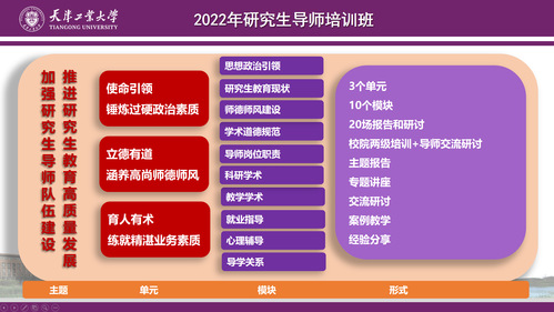 据悉,该系列培训共有3个单元、10个模块、20场报告和研讨,采用“校院两级培训+导师交流研讨”方式进行,包括主题报告、专题讲座、交流研讨、案例教学和经验分享等形式,培训对象为在岗所有研究生导师,培训时间为2022年10月31日至12月15日。(审稿:研究生院 肖志涛 编辑:党委宣传部 李焕峰)