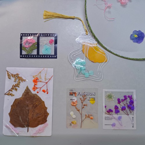 枫叶、银杏、西府海棠……各色植物将秋季的天工校园装点,而吹落的花枝和树叶都成为了同学们创作的原料。活动中,同学们将提前压制干燥的植物标本放置于书签、卡纸上进行搭配,并根据叶片的形状和设计的需要修剪卡纸,最后覆膜塑封、打孔、吊穗,创作出许愿瓶形、相框形、星星形、胶片形等形状各异的“天工之秋”植物书签和压花贺卡。每一页书签都是秋天的馈赠,每一张贺卡里都有天工的祝福。
