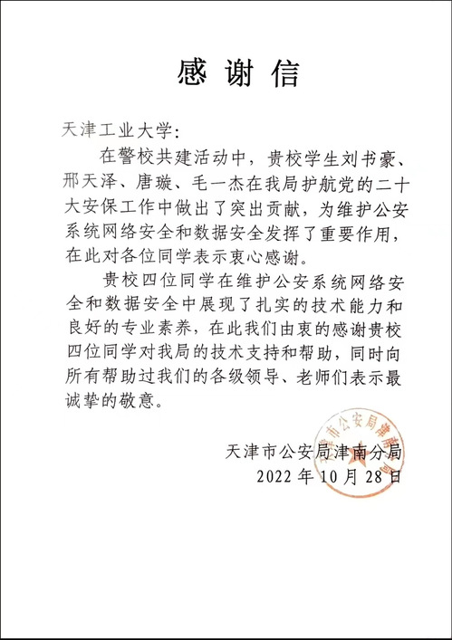 近日,我校收到一封来自天津市公安局津南分局的感谢信,信中对软件学院刘书豪、邢天泽、唐璇、毛一杰等同学对天津市公安局津南分局在护航党的二十大安保工作中作出的突出贡献表示感谢,对我校在保障公安系统网络安全和数据安全的大力支持表示感谢。