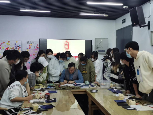 活动伊始,彭涌老师首先为同学们普及了篆刻工具、所用石材及篆刻程序等方面的基础知识,介绍了中国篆刻艺术的发展历程和审美特性,现场演示了篆刻的基本步骤,帮助大家了解中国文字书与刻的关系,体验方寸天地、气象万千的艺术内涵。在篆刻体验环节,每名同学设计了独一无二的感恩印章,在老师的耐心指导下将这枚感恩印章印刻出来。