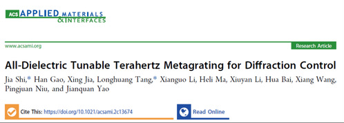 近日,我校电子与信息工程学院副教授石嘉在TOP期刊《ACS Applied Materials & Interfaces》(影响因子10.383)发表了题为《All-Dielectric Tunable Terahertz Metagrating for Diffraction Control》的研究成果,并被选为Supplementary Cover。石嘉副教授为该论文的第一作者和共同通讯作者,该成果由天津工业大学、中国工程物理研究院流体物理研究所、天津大学共同完成。论文链接:https://pubs.acs.org/doi/10.1021/acsami.2c13674