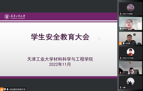 为全面提高学生安全意识,筑牢安全防线,2022年11月26日下午,材料科学与工程学院召开线上安全教育大会,学院党委副书记曾华英、副院长王文一出席会议并讲话,全院本、硕、博学生骨干、宿舍长参加了此次会议。