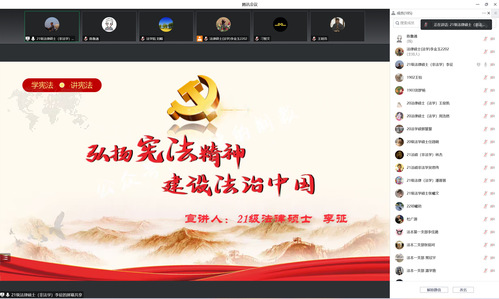 为深入学习宣传贯彻党的二十大精神,深入学习贯彻习近平法治思想,教育引导广大师生弘扬宪法精神、增强法治观念,深入推进八五普法和法治校园建设,12月2日,法学院线上开展2022年“宪法宣传周”主题宣讲活动。来自法学院、计算机科学与技术学院、软件学院、经济与管理学院的师生以及学校“卓越管理者培养计划”学员代表、第六期“青马工程”学员代表共180余人参与活动。宣讲活动由法学院组织员刘峰老师主持。