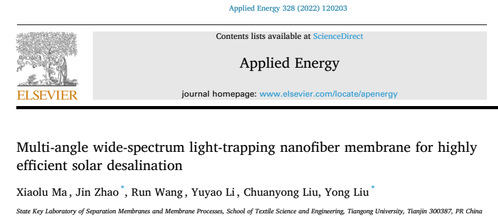 研究表明,该纳米纤维复合膜在0o-80o的广角范围内平均吸光率超过90%,在200-2500nm广谱范围内的平均吸光率可达95%,光热转换能力快(1sun下照射30s内升温至70℃)。在1个太阳强度照射(1kWm-2)时,蒸发速率可达1.73kgm-2h-1,而蒸发效率可达94%,具有优异的广谱多角度吸光性能、隔热性能、高孔隙率、柔软性和实用性,为不同光照条件下太阳能蒸馏水材料的设计提供了新的思路。相关研究成果以“Multi-angle wide-spectrum light-trapping nanofiber membrane for highly efficient solar desalination”为题目发表于期刊《Applied Energy》(SCI一区,2021年影响因子11.446)上,论文第一作者为纺织科学与工程学院博士研究生马晓璐,共同通讯作者为赵晋博士和刘雍教授。