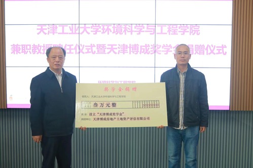 2023年3月8日上午,我校环境科学与工程学院举办兼职教授聘任暨天津博成奖学金捐赠仪式,活动在环境学院报告厅举行。天津市土地学会理事长崔家颖,天津博成房地产土地资产评估有限公司董事长宋红剑和学院领导出席了此次活动。