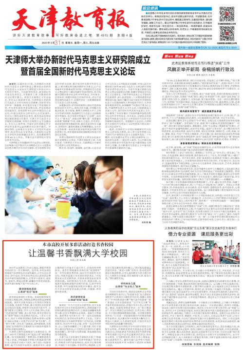 2023年3月31日,《天津教育报》头版以《本市高校开展多彩活动打造书香校园让温馨书香飘满大学校园》为题对我校进行了报道。现将全文转发如下,以飨读者。
