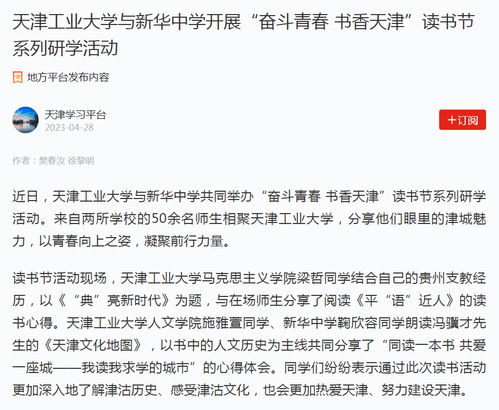 2023年4月28日,学习强国以《天津工业大学与新华中学开展“奋斗青春 书香天津”读书节系列研学活动》为题对我校进行了报道。现将全文转发如下,以飨读者。