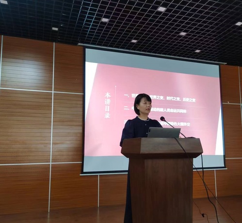 张霞老师以《推动构建人类命运共同体》为题,以人类命运共同体理念提出十周年为契机,从世界之问、中国之答和中国之路三个层面深入阐述了推动构建人类命运共同体的重要意义。张老师讲到,十年来人类命运共同体的内涵不断丰富发展,实践不断走深走实,建设持久和平、普遍安全、共同繁荣、开放包容、清洁美丽的世界,已成为引领时代潮流和人类前进方向的鲜明旗帜。新时代我们要全面推进中国特色大国外交,牢牢把握服务民族复兴、促进人类进步这条主线,通过推动建设新型国际关系,积极参与全球治理体系改革,推动构建人类命运共同体,携手开创人类更加美好未来。