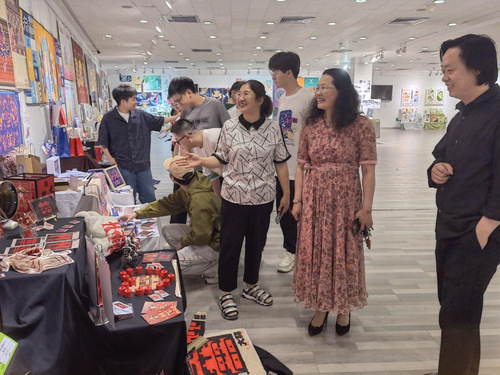 师生们共同参观了艺术学院视觉传达设计系、环境设计系、产品设计系、工艺美术系研究生毕业作品展。毕业生的作品主题多样、内涵丰富、特色鲜明,他们通过精彩的设计呈现,展示了年轻学子对社会文化的诠释和对艺术设计的感知。赵老师详细介绍了作品的创作主题、创作背景、文化内涵和作品的市场应用情况,作品类型主要包括服务于地方的文创产品设计、包装设计、室内设计、装置艺术设计以及突出地域特色的手工设计制作。参观师生对参展作品中体现出的时代精神与创新意识深感震撼。