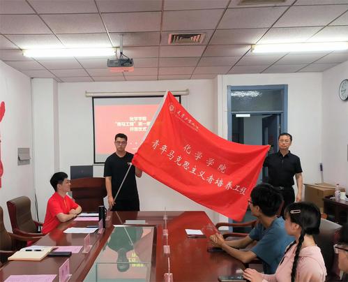 开班仪式上,学院副书记李志鹏宣读成立化学学院“青年马克思主义者培养工程”第一期培训班的决定及学员名单。党总支书记许世超为院青马班授旗。
