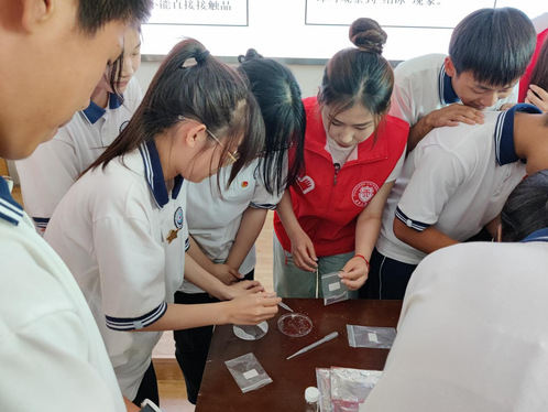 在天津市南洋工业学校的阶梯教室,材料科学与工程学院“材”随心“愿”宣讲团成员以一幅幅有关井冈山的影像资料为指引,带领大家追忆井冈山革命历史和孕育其中的井冈山精神。天津市南洋工业学校话剧团的同学们演出了《穿越时空的对话》节目,以时空穿越的形式引导同学们树立正确的人生理想。随后,宣讲团的成员们发挥专业特长,带领学生们开展《点水成冰》的小实验,宣讲团成员将实验过程分为四步耐心讲解,一步一步引导同学们动手操作,成功制作出了“点水成冰”的神奇现象,让同学们在盛夏体验了冰雪魔法。