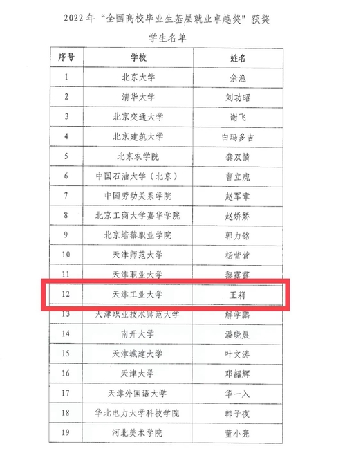 一直以来,我校高度重视学生就业观教育,积极响应国家号召,认真贯彻落实国家和天津市关于引导和鼓励高校毕业生面向基层就业的文件精神,大力引导毕业生树立“到基层去,到西部去,到祖国最需要的地方去建功立业”的志向和抱负,一批又一批的天工学子将个人理想追求融入到党和国家的事业中,为全面建设社会主义现代化国家施展才干、贡献才智。王莉是我校扎根基层毕业生的优秀代表,本次荣誉的获得是我校育人工作成效的生动体现。