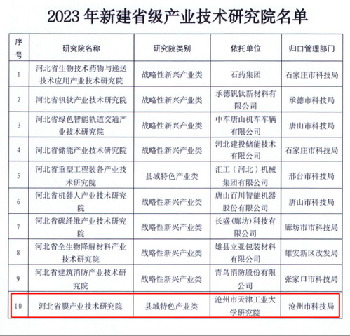 近日,河北省科学技术厅发布了《河北省科学技术厅关于2023年新建省级产业技术研究院的通知》,以天津工业大学沧州研究院为依托单位的河北省膜产业技术研究院成功获批为2023年新建省级产业技术研究院。