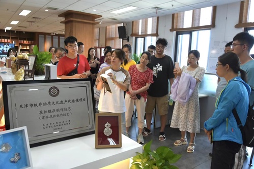 上午10时,展览迎来了参观师生及新生家长,大家驻足鉴赏,不时提问。天津市市级非遗“津派花丝”第五代传承人董小珍热心解答,耐心指导。在实物展示柜前,新生及家长们被一件件作品的雕花镂空等设计深深吸引,赞叹不已。参观的新生们纷纷表示,“热爱我求学的城市”不仅仅是一句口号,天津也是第二故乡,今天感受到这座城市文化的内涵和魅力,发自内心地想在津沽大地扎根奋斗!